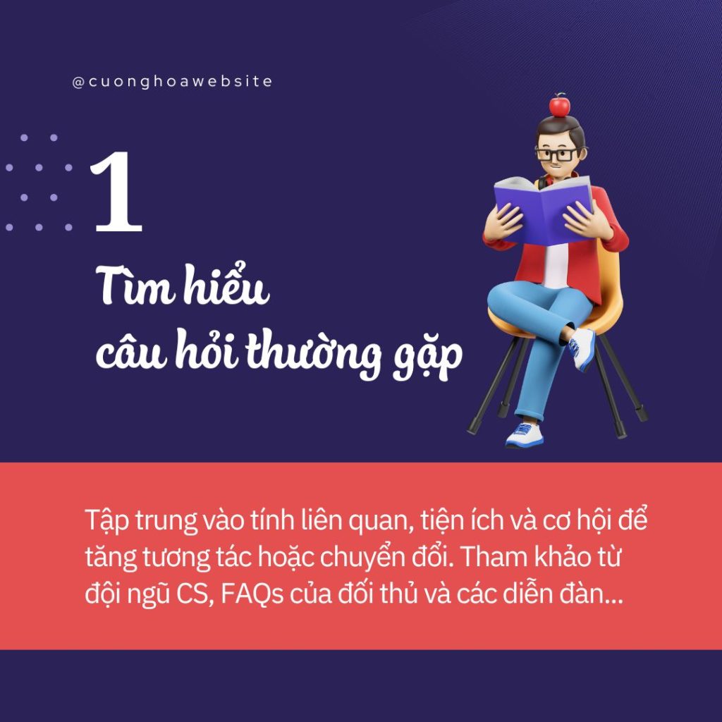 Để biết nên chọn nội dung gì cho trang FAQ, hãy xem quá trình mua hàng của khách hàng và ghi những câu hỏi mà người mới có thể có. Hoặc tham khảo ở trang FAQ của các đối thủ và dịch vụ liên quan. Nội dung nên tập trung đến sự liên quan, tiện ích và cơ hội để biến câu hỏi thành tương tác hoặc chuyển đổi.