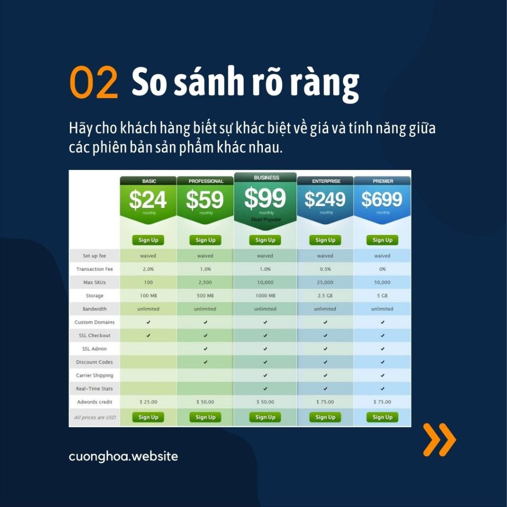 Nếu bạn đang bán nhiều phiên bản của một sản phẩm ở các mức giá khác nhau, hãy so sánh ngắn gọn về giá cả và tính năng sản phẩm.