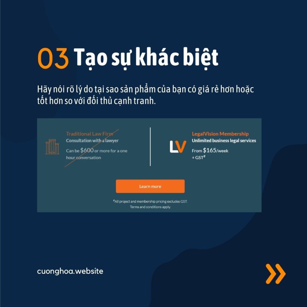 Tập trung vào giá nếu sản phẩm của bạn bán lẻ với giá thấp hơn đối thủ cạnh tranh. Hoặc nếu đối thủ cạnh tranh bán một sản phẩm tương tự ở cùng tầm giá, hãy làm nổi bật những đặc điểm khiến sản phẩm của bạn vượt trội hơn hoặc có giá trị tốt hơn.