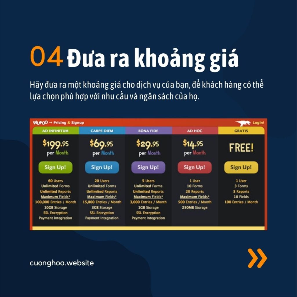 Cung cấp một khoảng giá cho dịch vụ của bạn, khách hàng có thể lựa chọn mức giá phù hợp với nhu cầu và ngân sách của họ. Bằng cách đó, khách hàng có mức giá sàn và mức giá trần.