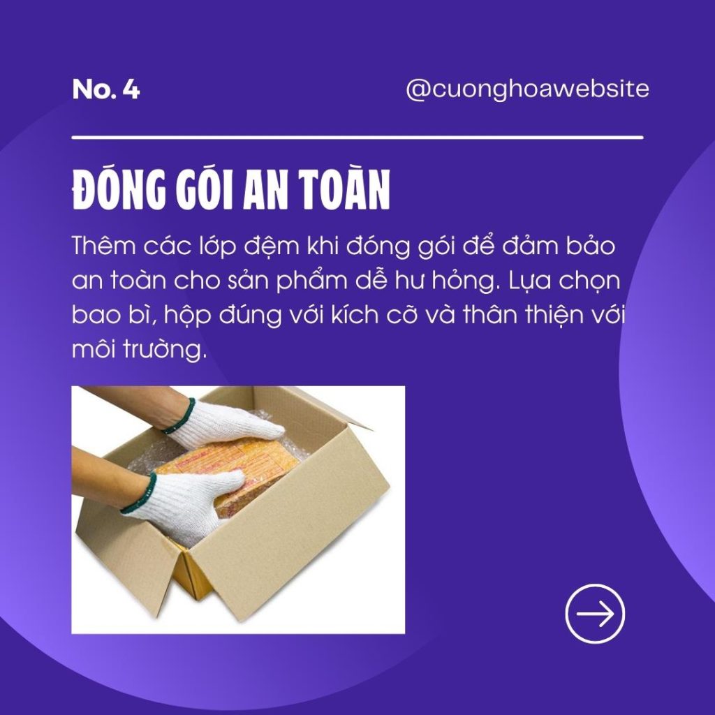 Khi đóng gói hàng cho khách hàng, bạn nên dùng những lớp đệm để bảo vệ sản phẩm khỏi bể vỡ hoặc hư hỏng. Bạn cũng nên chọn hộp đựng vừa vặn, nhẹ và thân thiện với môi trường. Điều này sẽ giúp bạn tiết kiệm chi phí vận chuyển và bảo vệ môi trường của chúng ta.