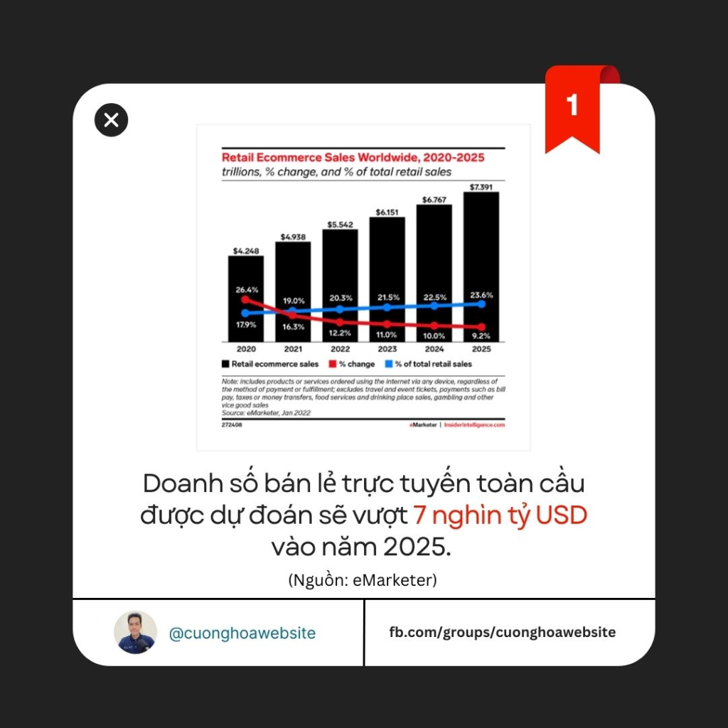 Mình có tổng hợp được từ nhiều nguồn khác nhau các chỉ số đáng lưu tâm về tình hình bán hàng thương mại điện tử gần đây cho các anh chị tham khảo. Dự đoán doanh số bán lẻ trực tuyến toàn cầu sẽ vượt 7 nghìn tỷ USD vào 2025