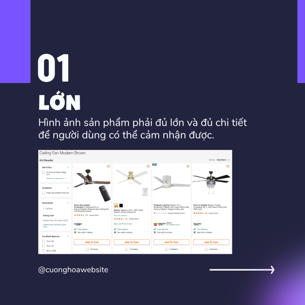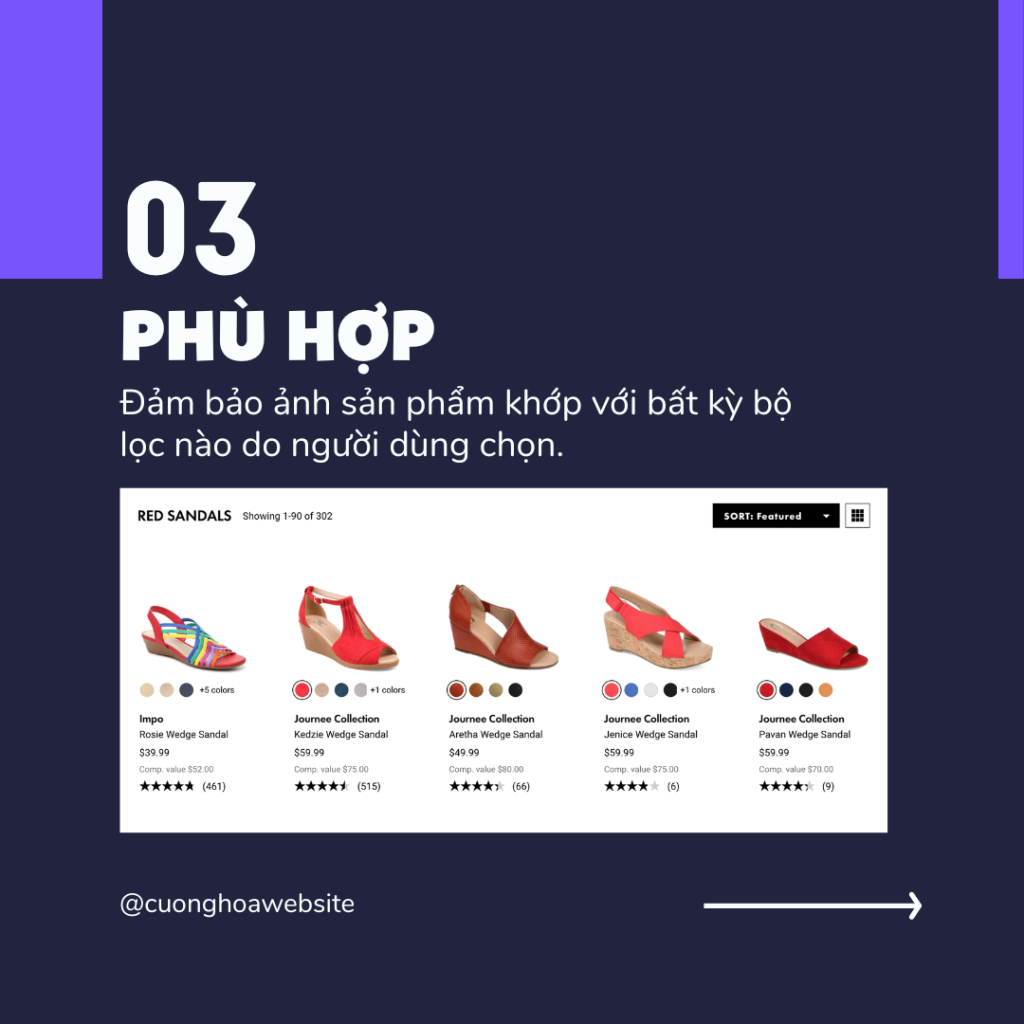 Ảnh sản phẩm trên các trang nhóm sản phẩm phải với bất kỳ bộ lọc nào do người dùng chọn (như màu sắc). Những chi tiết này giúp khách hàng tin tưởng vào trang web và kết quả tìm kiếm.