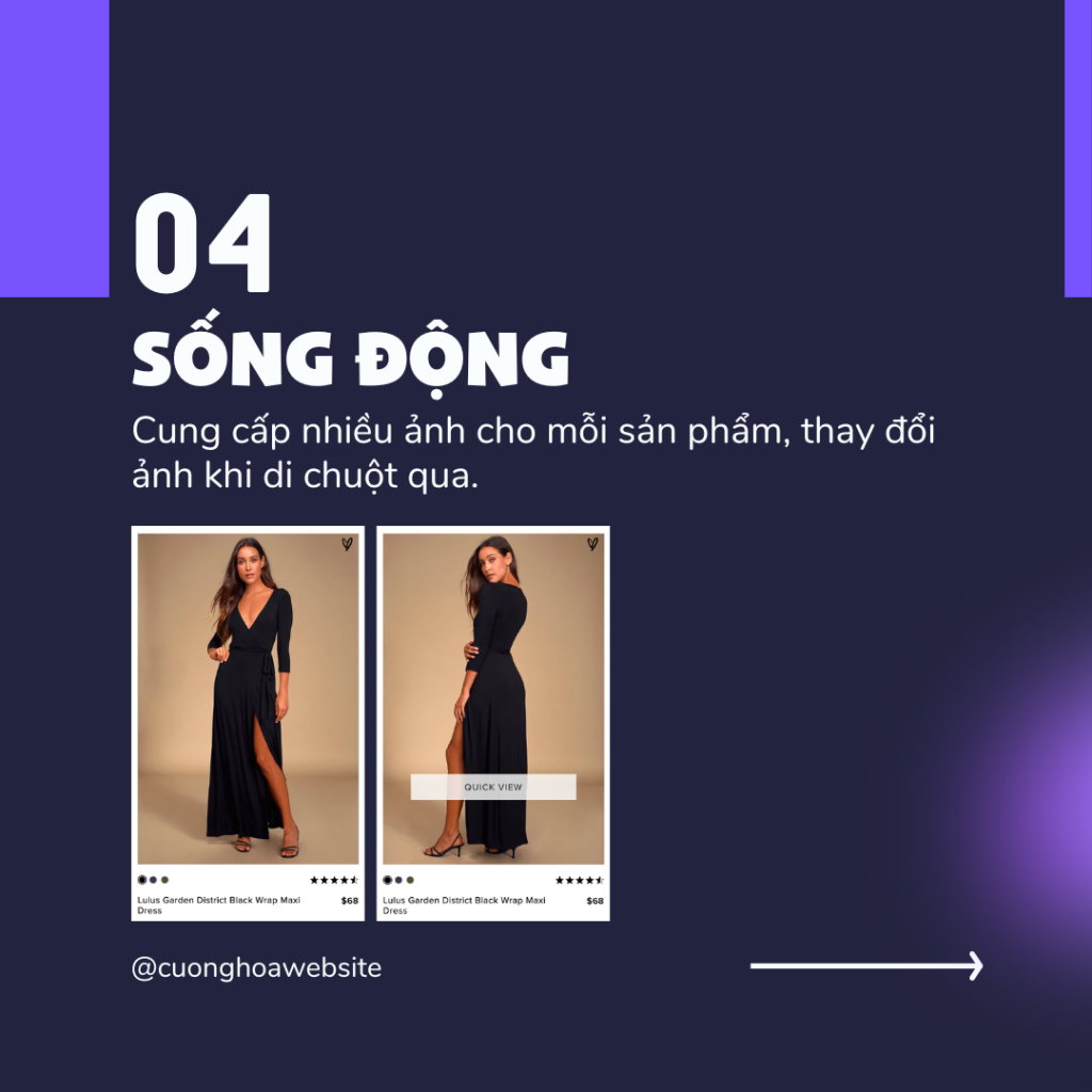 Cung cấp nhiều ảnh của từng sản phẩm trên các trang nhóm sản phẩm giúp người dùng biết thêm chi tiết để dễ dàng quyết định chọn sản phẩm. Bạn có thể làm điều này bằng cách thay đổi ảnh khi di chuột vào ảnh đầu tiên.
