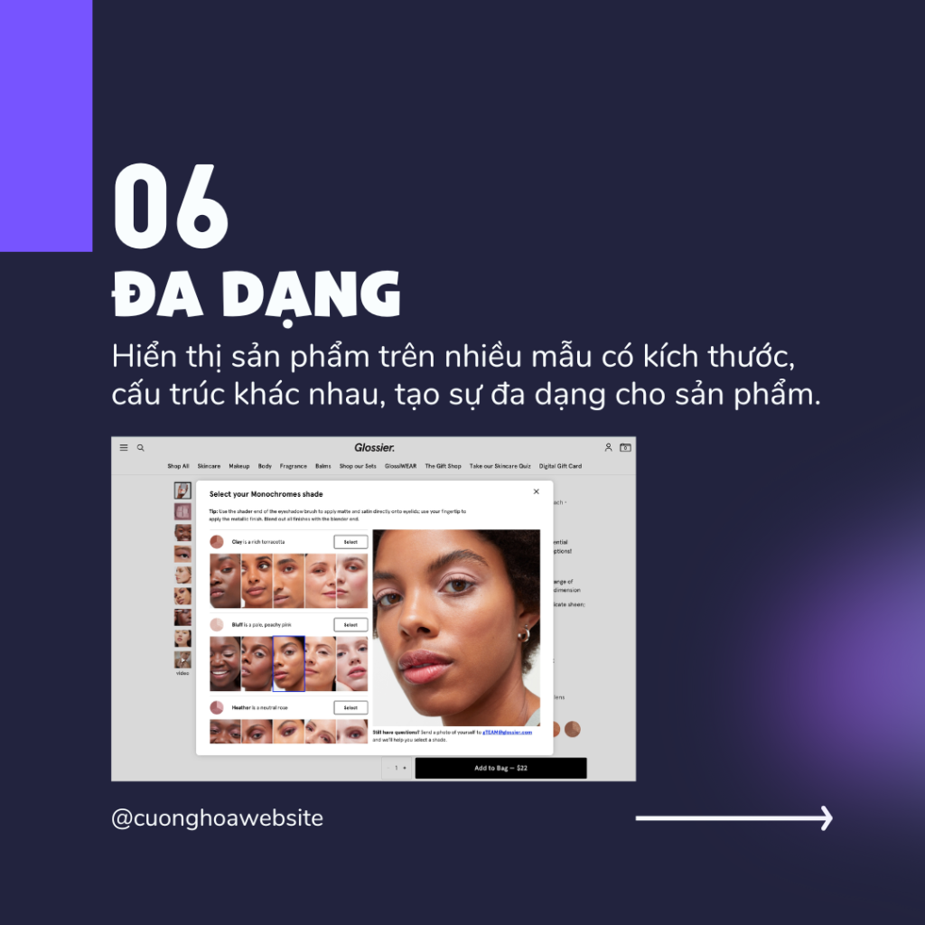 Hiển thị sản phẩm trên nhiều người mẫu khác nhau về màu da, độ tuổi, dân tộc và hình dáng. Khách hàng dễ dàng tìm thấy sản phẩm phù hợp với họ.