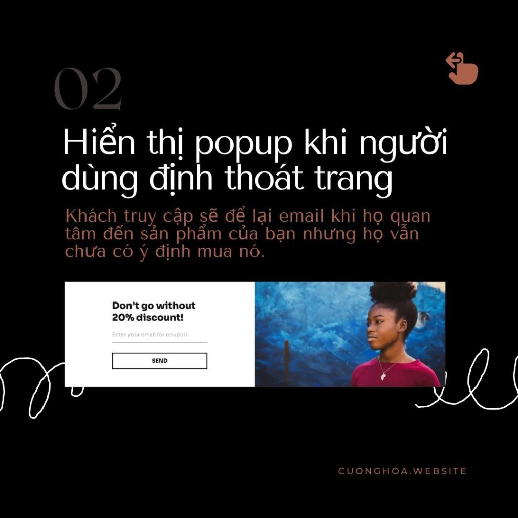 Bạn có thể tăng số người đăng ký email bằng cách dùng popup khi khách truy cập muốn rời trang web. Popup này sẽ nhắc nhở họ về những lợi ích của việc đăng ký email. Có thể họ chưa biết cách đăng ký, hoặc họ thấy hấp dẫn với ưu đãi trong cửa sổ bật lên, hoặc họ đã ghé trang web trước đó nhưng chưa quan tâm đến việc đăng ký. Popup này có thể khiến từ 4% đến 7% khách truy cập quyết định đăng ký email.