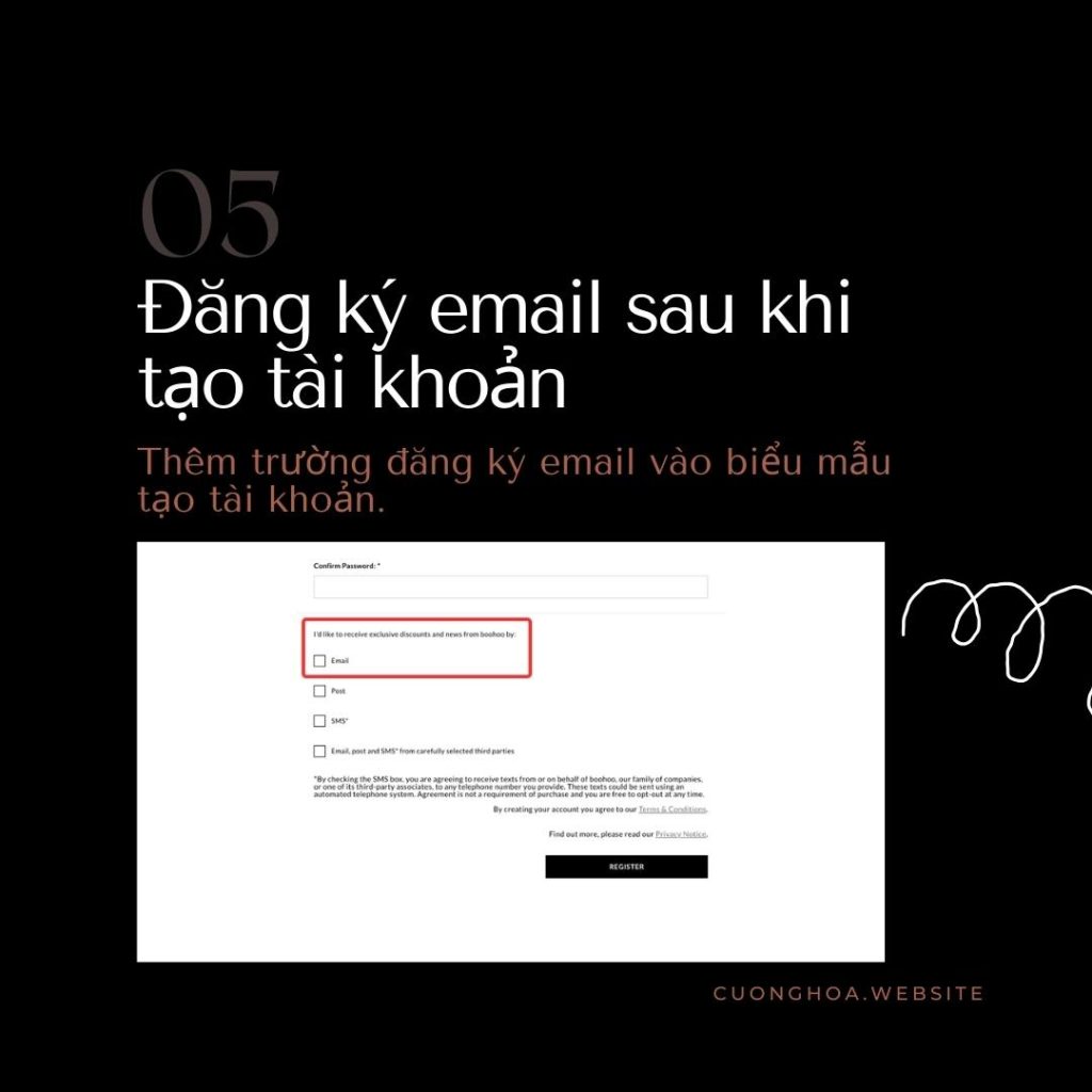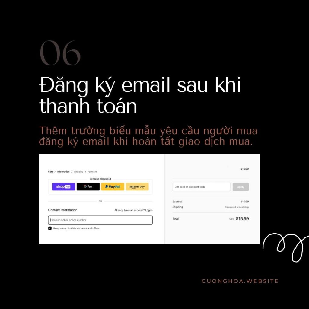 Sau khi khách hàng thanh toán, bạn nên hỏi họ có muốn nhận email hay không. Bằng cách thêm trường biểu mẫu đăng ký email vào trang thanh toán, bạn có thể chọn trước nút đăng ký email hoặc không, bạn sẽ có nhiều email hơn. Nếu khách hàng không thích thì có thể hủy đăng ký.
