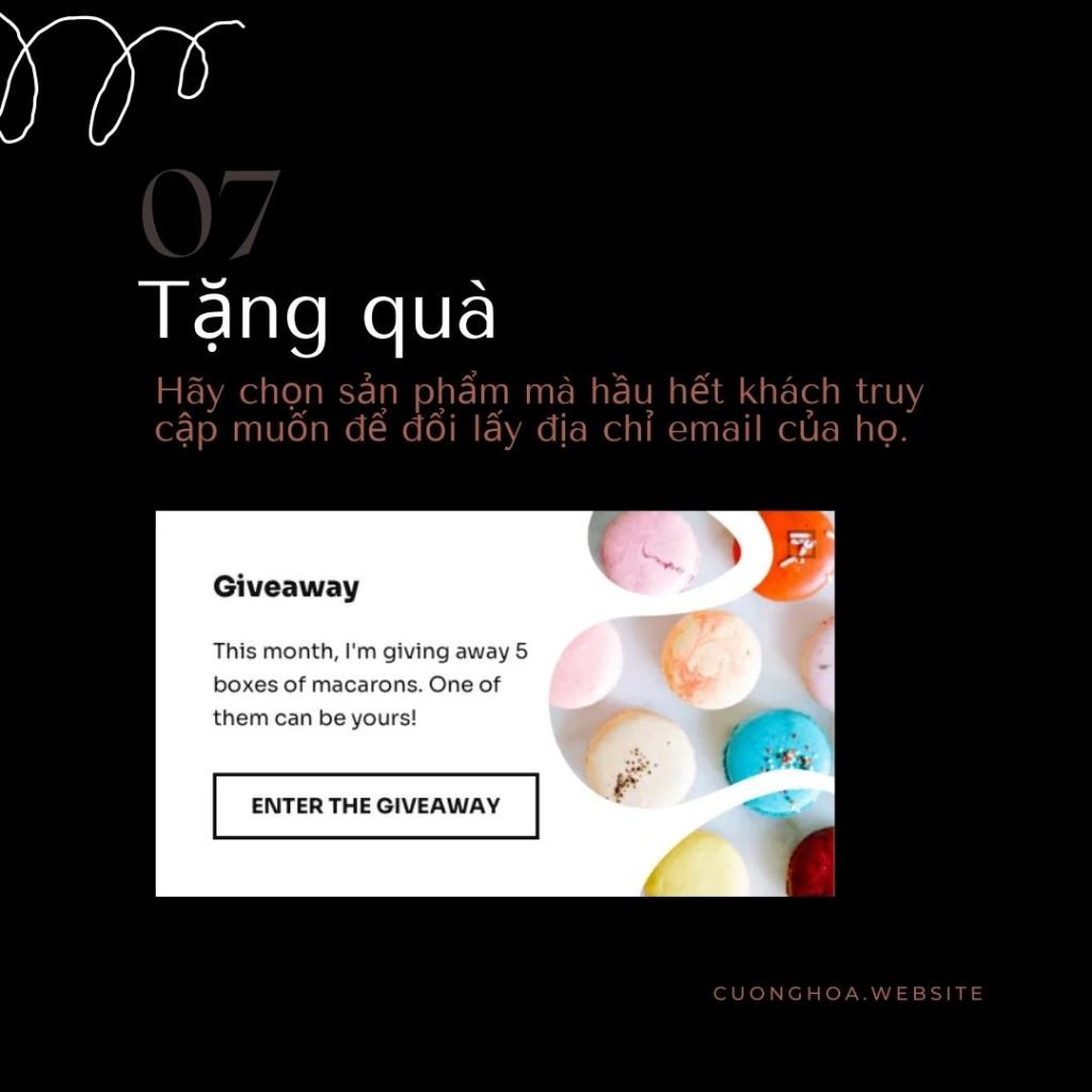 Phần lớn mọi người đều thích quà tặng, khách truy cập website của bạn cũng không ngoại lệ. Bạn có thể dùng quà tặng để đổi lấy email của họ, vì họ sẽ thích nhận được những thứ miễn phí. Quà tặng sẽ hiệu quả nếu nó phù hợp với nhu cầu của khách truy cập. Bạn nên chọn một sản phẩm (hoặc một bộ sản phẩm) mà bạn biết họ sẽ thích, có thể là sản phẩm bán chạy nhất hoặc mới nhất của bạn. Bạn cũng có thể tặng nhiều loại quà khác nhau, như mã giảm giá, v.v.