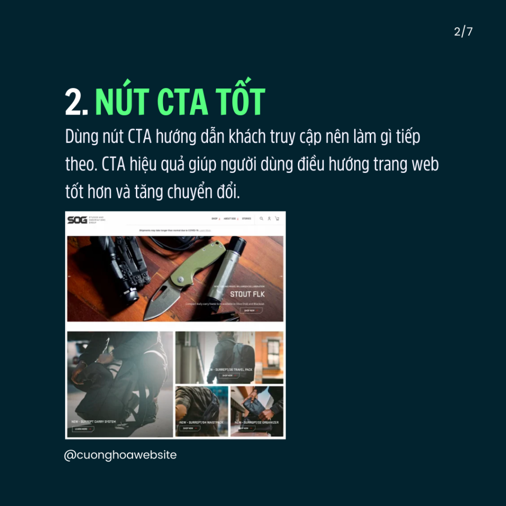 CTA là những nút bấm để khách hàng biết phải làm gì tiếp theo. CTA tốt sẽ giúp khách hàng dễ dàng duyệt trang web của bạn và mua hàng hơn. Bạn nên chọn CTA phù hợp với khách hàng của bạn (về: từ ngữ, màu sắc, vị trí)