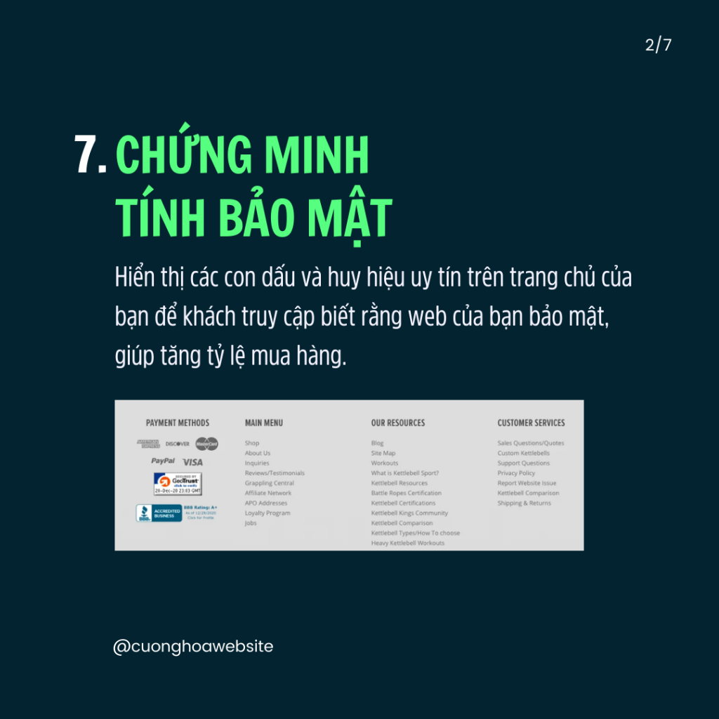 Hack và đánh cắp thông tin mua sắm trực tuyến ngày càng phổ biến, khách hàng cần được đảm bảo thông tin của họ phải an toàn và bảo mật. Để tạo sự an tâm cho khách hàng bạn có thể đặt các con dấu và huy hiệu uy tín trên trang chủ của bạn, cho khách hàng xem thông tin bảo mật của bạn khi họ bấm vào những biểu tượng này ở phần chân trang.