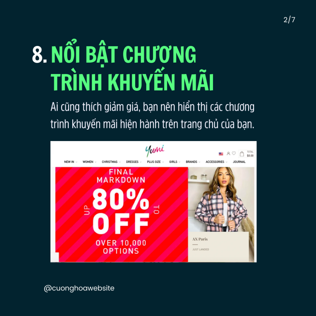 Ai cũng thích giảm giá, khách hàng của bạn cũng không ngoại lệ, họ thích khi bạn có những ưu đãi hấp dẫn trên trang chủ của bạn. Hãy hiển thị các chương trình khuyến mãi hiện hành trên trang chủ một cách nổi bật để giữ chân khách hàng và tạo động lực để họ mua hàng.