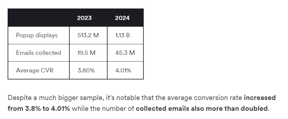 Dựa trên 1.1 tỉ lượt hiển thị Popup trong 2023 và 2024 thì thấy CVR lên 4.01%. Nguồn: Wisepops