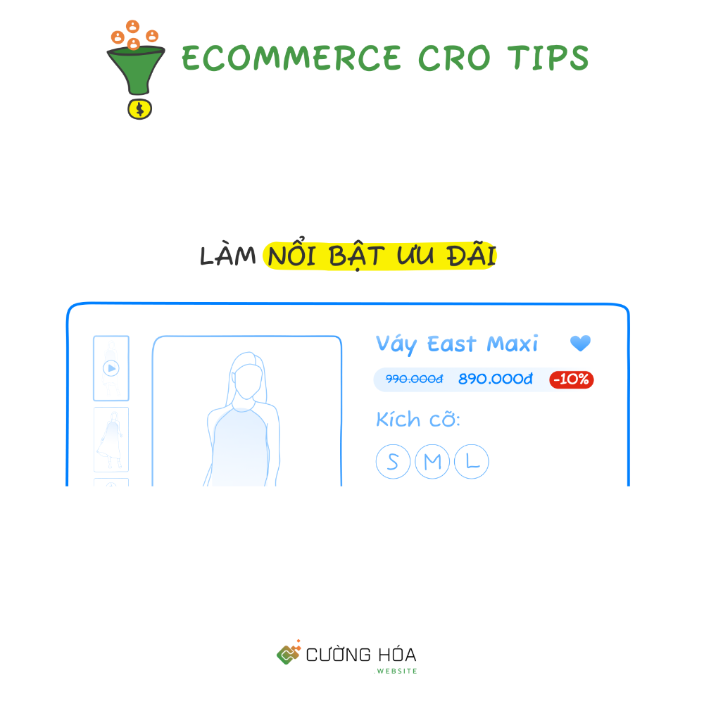 - Đặt thông tin ưu đãi ở những vị trí dễ thấy trên trang web, như ngay dưới tiêu đề sản phẩm, trong phần thông tin chi tiết, hoặc ngay trên nút “Thêm vào giỏ”.
