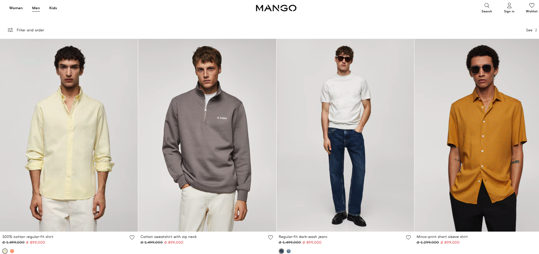 Mango sử dụng các biểu tượng, nhãn hiệu và màu sắc nổi bật như “Giảm giá”, “Mới về” để thu hút sự chú ý của khách hàng. Bên cạnh đó, Mango còn hiển thị thông tin giá gốc, giá sale và phần trăm giảm giá ở vị trí nổi bật, sử dụng kích thước chữ lớn và màu sắc tương phản.
